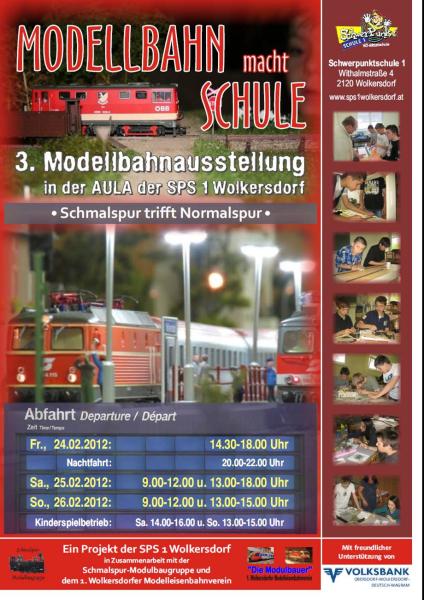 von 24.-26. 2.2012 Waren wir wieder in der Schwerpunktschule 1 in Wolkersdorf zu Gast. Als Abschluß eines Schulprojektes, bei dem von den Schülern Module nach Originalvorbild (allerdings in HO) gebaut wurden, gabe es eine Gemeinschaftsausstellung mit dem ansässigen Modubauverein.