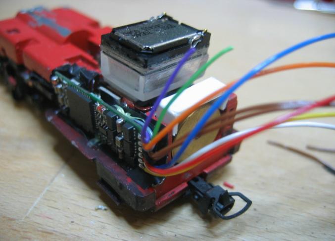 - Der Lautsprecher sitzt in Längsrichtung am Motor und ist an diesem mit 2K Kleber befestigt. Das ergibt sehr gute Resonanz durch den Motor und auch noch Platz für Lokführer und Heizer.