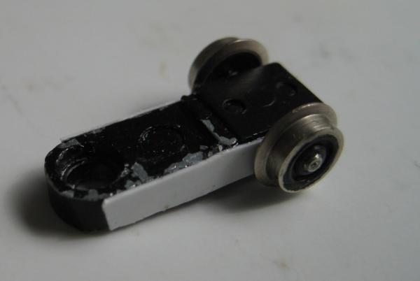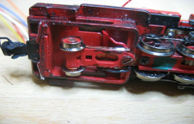 - Auch hier wurde die Schleppachse zusätzlich zur Stromabnahme herangezogen, was etwas aufwändiger ist, da der Rahmen der Schleppachse aus Metall ist und daher Kunststoffplättchen unter die Schleifer geklebt werden müssen